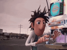 - Неожиданные последствия: Устройство выходит из строя, и с неба начинают выпадать не просто капли воды, а настоящие блюда — фрикадельки, мороженое, пицца, что приводит к хаосу в городе.